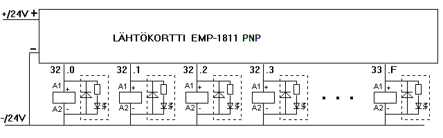 Kuvassa PNP-tyyppinen liitäntä. Lähtökortissa on 32 lähtöä, jotka on numeroitu 32.0 ... 32.F ja 33.0 ... 33.F