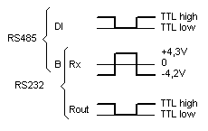Jännitetasot lähetyssuunnassa RS485 -> RS232
